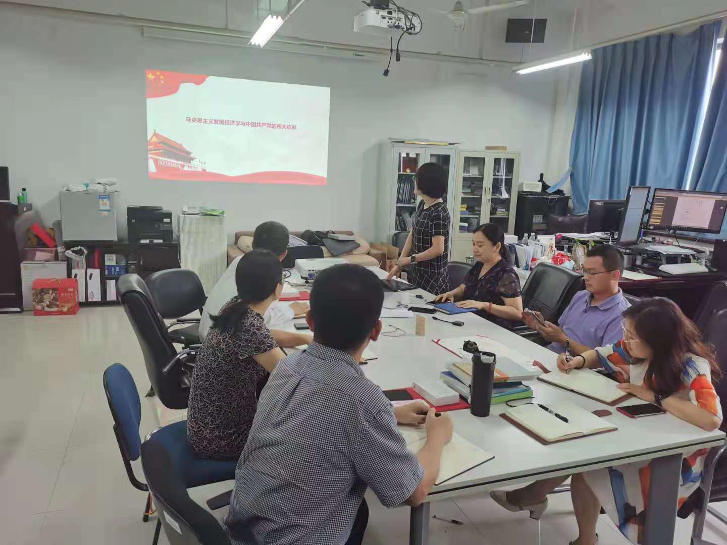 座谈会结束后,支部书记阎洁为全体党员讲述《马克思主义发展经济学与中国共产党的伟大成就》党课,再一次深刻体会到习近平主席讲话的精神,中华民族迎来了从站起来、富起来到强起来的伟大飞跃,实现了中华民族伟大复兴,完成了党的第一个百年奋斗目标,向着下一个百年目标前进。“请党放心、强国有我”,支部的青年党员勇于担当重任,在支部建设、科研教学中发挥着越来越重要的作用。百年征程,筚路蓝缕;百年奋斗,矢志不渝。风电支部全体教职员工纷纷表示,学思践悟、知行合一,奋发进取、担当作为,书写风电新篇章。