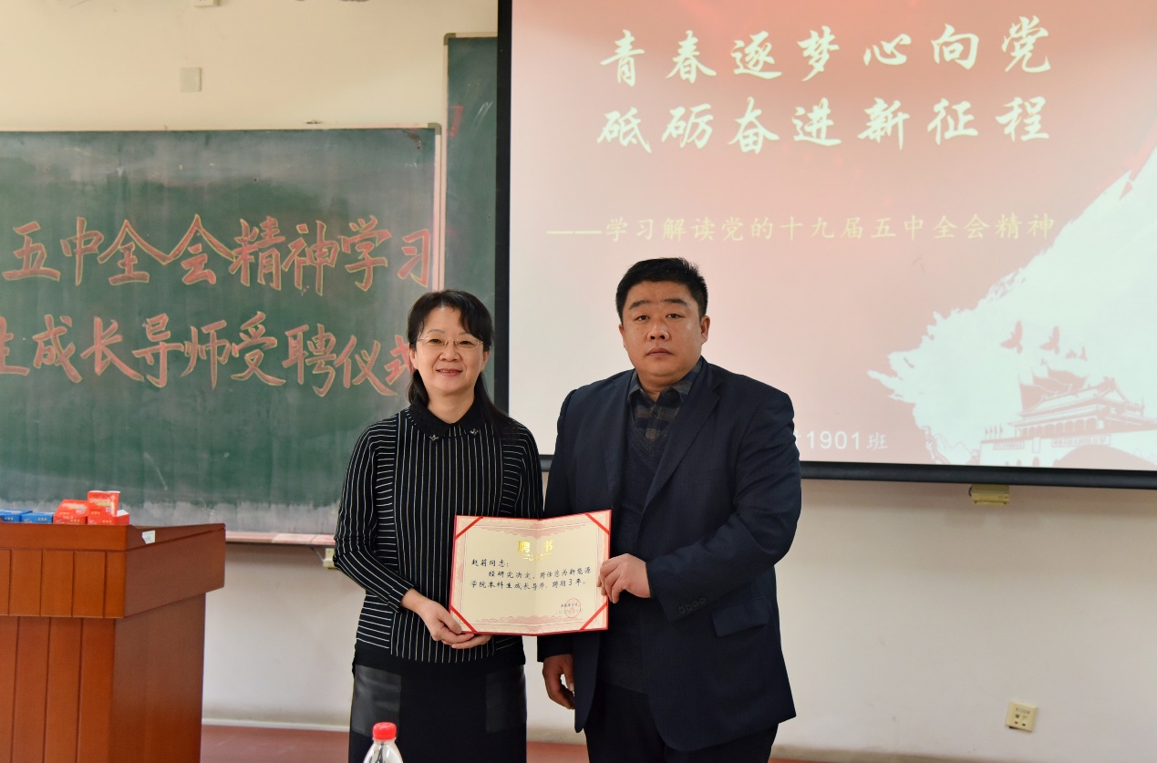 2020年12月9日下午,澳门六合彩内幕资料 能材1901班学习十九届五中全会精神班会暨本科生成长导师受聘仪式在主B309召开。为了加强同学们的思想政治建设,宣传十九届五中全会精神,落实立德树人根本任务,践行三全育人教育理念,组织开展了本次交流活动。澳门六合彩内幕资料 党委书记王集令、本科生成长导师赵莉、辅导员杨子发出席本次班会。