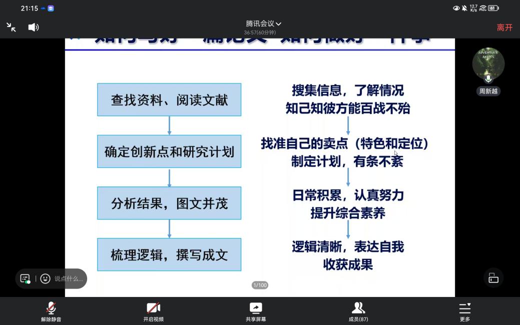 周新越,现就读于澳门六合彩内幕资料 博新能源2165班,获得国家奖学金、优秀博士奖学金。她从“科技论文、竞赛和会议、社会交流会”三个方面引导同学们如何平衡科研与生活。她表示,卓越的科研成就来自条理清晰的研究思路:以文献阅读掌握研究现状,以精确找准创新点打开局面,加之以逻辑通顺的成文结构和图文并茂的数据分析,才能生成一篇高水平有价值的好文章。另外,她鼓励大家让社会交流会成为学术生活的添加剂,培养自己待人接物的能力,并学会调节心态,坦然面对挫折。