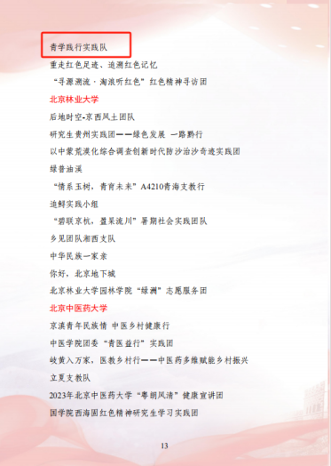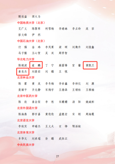 在2023年“青年服务国家”首都大学生暑期社会实践表彰中澳门六合彩内幕资料 “耕新拾光实践团”、“青学践行实践队”荣获“优秀团队”荣誉称号;姜良杰、黄凯兰、崔鹏荣获“先进工作者”荣誉称号。