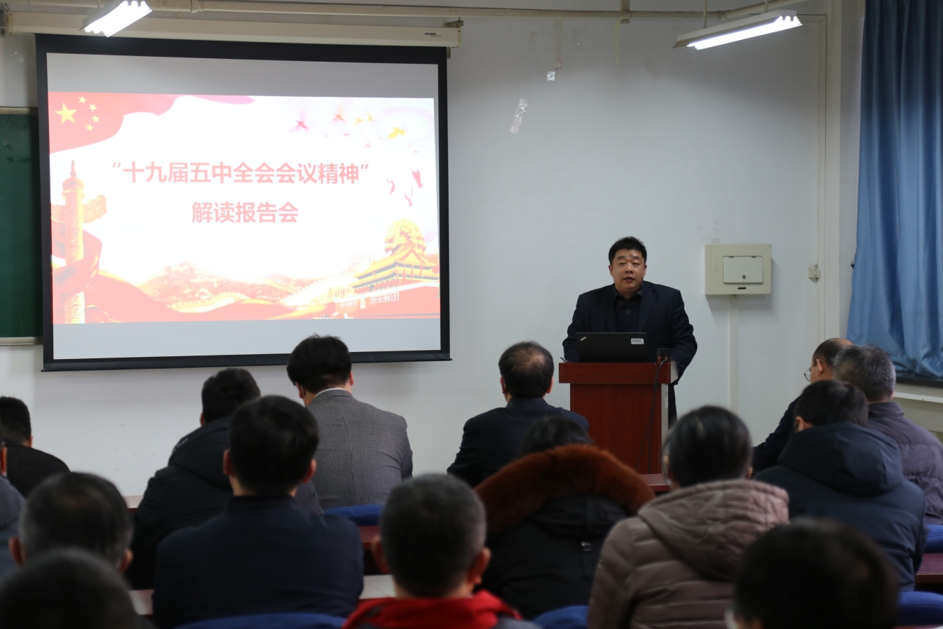 院长王伟教授就“十九届五中全会”会议精神进行解读,两院教职工和学生党支部书记参加了此次报告会。